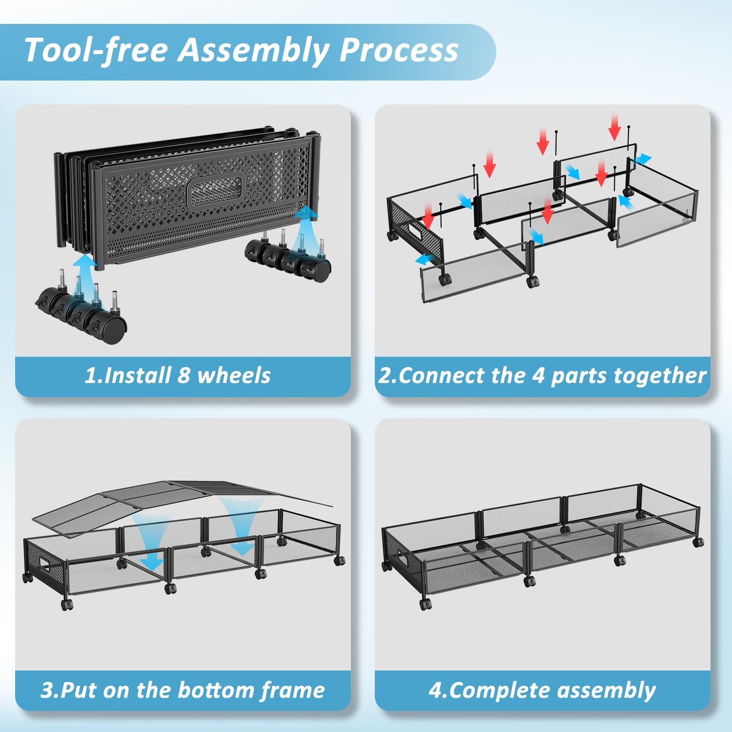 EASY ASSEMBLY: Assembly is a breeze with rolling under bed organizer, as no tools are required. Featuring a simple folding KD structure, simply use 6 pins to connect the 4 parts and place the bottom frame to complete assembly